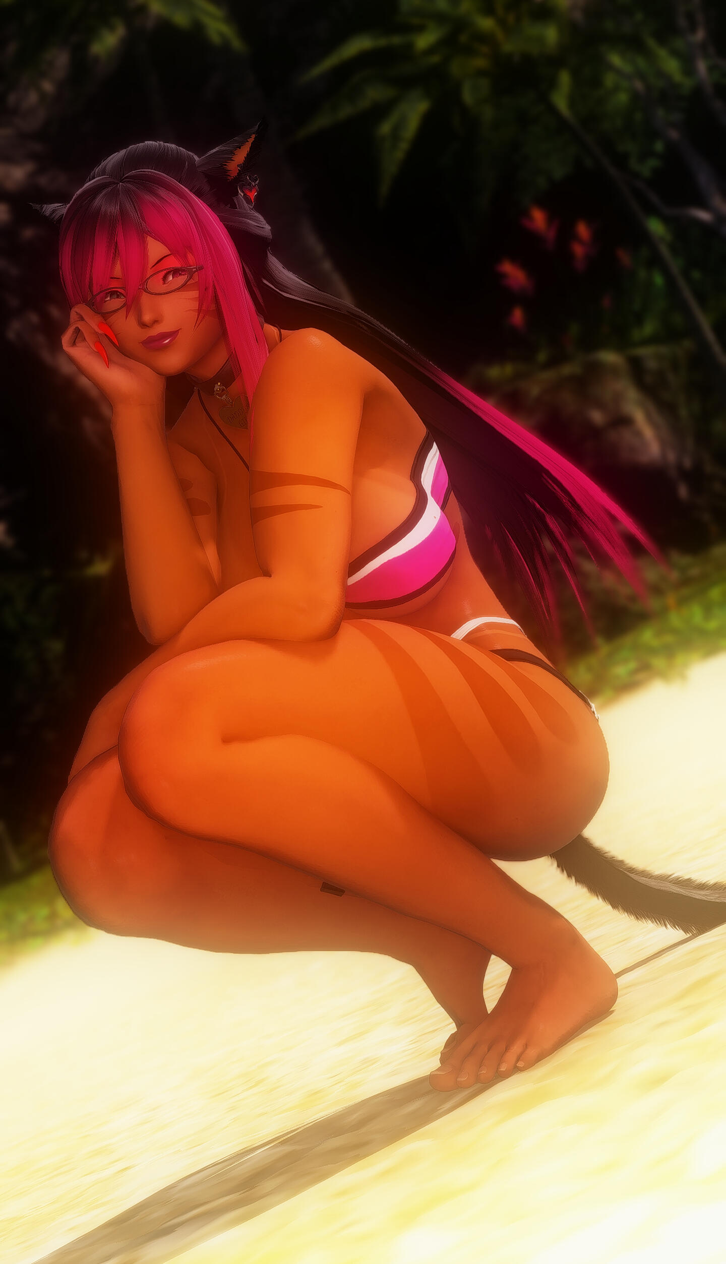 However, on the eve of their planned escape, X'phar betrayed her, revealing their plan to her father. To make an example for the rest of the tribe, her father executed X'phar in front of them all. Poke narrowly escaped her father's wrath because her mother intervened and provided her with a chance to flee. Torn from her tribe and the only life she had ever known, she was forced into the unknown world alone. Alone and with not a gil to her name, she had did whatever was necessary to live, selling her services as well as her body to put food in her mouth. Her exile led her across much of Eorzea and eventually to the Far East and the city of Kugane. She knew that if her father ever found her, she would either be killed or, worse, returned to her tribe. To conceal her identity and the trauma she had endured, she adopted the persona of Poke Chan. The name was inspired by a friendly girl with the last name 'Chan' in the city who would feed her when she was downtrodden. The girl would poke her awake and say 'poke,' hence the origin of her first name. This girl became a guiding light that helped her get back on her feet and continue with her life.While she remains guarded and mistrustful around new people, she can't suppress her curious nature. Poke has continued to move from one job to another, including working as a waitress, dancer, and escort, before becoming a traveling dancer and working at the Ten no Ji when they are open. Despite this, she still takes on small other jobs on the side.